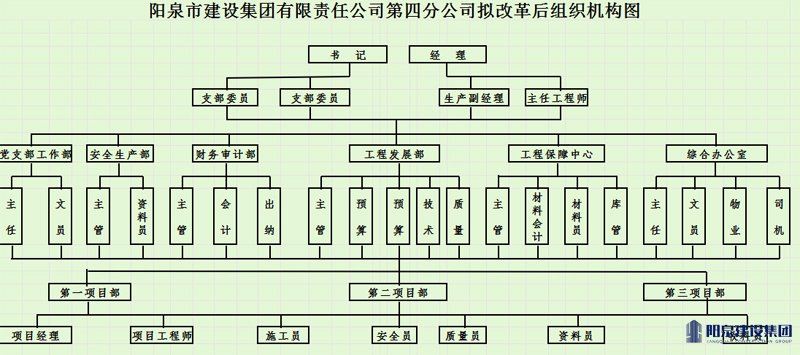 阳泉市建设集团有限责任公司第四分公司成立于1988年4月13日,隶属于阳泉市建设集团有限责任公司,公司拥有各类经营管理和专业技术人才,配备与施工能力相适应的各类机械设备,积累了丰富的施工经验,具有独立承担各类大中型建设项目的综合实力。公司为山西省建筑业协会团体“会员单位”;山西省土木建筑学会建筑施工分会“会员单位”;山西省土木建筑学会冬季施工分会“会员单位”。 公司现有职工50名,现有职工中大学本科以上10人,大专以上学历20人;有职称人员30人,其中高级工程师2人,工程师8人,助理工程师等10人;工程技术管理人员45人,其中国家一级建造师2人,二级建造师8人,施工员、质量员、安全员等项目管理十大员22人。 公司设有党支部工作部、综合办公室、安全生产部、财务审计部、工程发展部、工程保障中心等职能科室,下设第一项目部、第二项目部、第三项目部等工程项目管理机构。公司具有承担大中型工业与民用建筑、装饰装潢、道路桥梁、土石方挖运,钢结构安装、防水防腐保温、建筑机械施工等综合施工能力,年建施能力在10000万元以上。公司先后承建了:全市拱桥跨度最长、难度最大的李家庄大桥工程;集办公、住宅、娱乐、餐饮为一体的高层建筑市农业大厦工程;台商独资的方大添加剂(阳泉)有限公司办公楼、车间、仓库及厂区工程;公用事业局9#住宅楼、梅苑3#住宅楼、鸿龙湾小区1#、5#住宅楼、燕竹花园4-1#、6-3#住宅楼工程、盂县清城阳光新村7#、8#、9#住宅楼等多项住宅工程,鸿龙湾小区1#、5#住宅楼、漾泉小区1#-12#楼、阳泉市超力汽配研发中心汽配办公楼及汽配车间、阳泉市郊区荫营镇老虎沟村瑞兴家园7#、8#住宅楼;阳泉市精神病医院扩建工程;半沟红薯保鲜恒温库深加工项目;兴峪输变电升级改造项目35KV变电站土建工程;辰通瓦斯发电项目土建工程、阳泉市民爆器材专营有限公司火工库、盂县清城阳光新区住宅楼8#、9#、10#楼以及阳泉市矿区“三供一业”移交物业小区维修改造项目(三矿区域)八个小区等多个重点工程。 公司先后荣获山西省工商局行政管理局“守合同重信用企业”;阳泉市人民政府“守合同重信用企业”;阳泉市人民政府“安全生产先进企业”;阳泉市城区人民政府“文明单位”;阳泉市劳动竞赛委员会集体“三等功”;阳泉市安全生产监督监察局“安康杯优胜企业”。